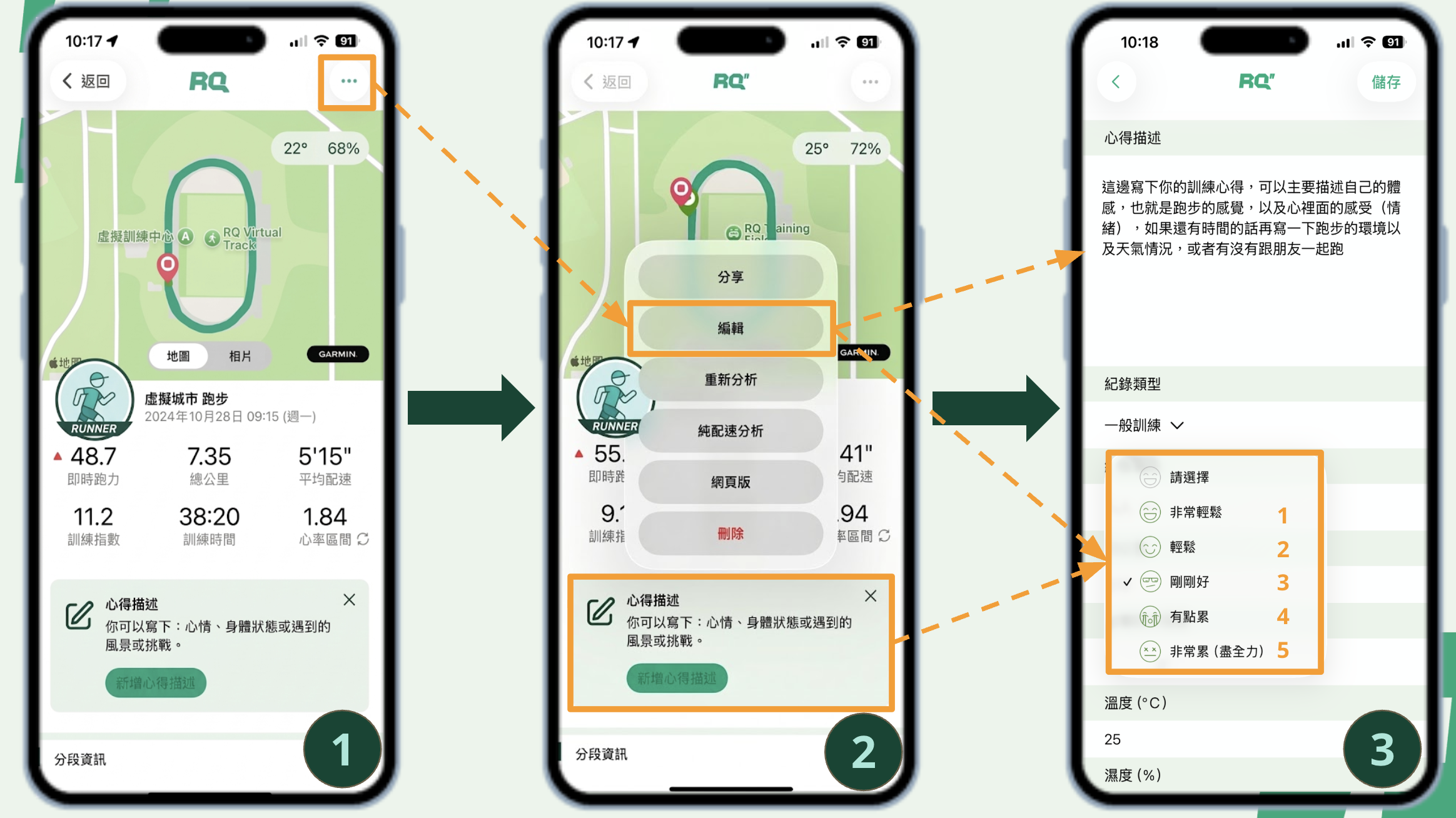 總結來說,當你訓練完成後,只要點進當天的訓練紀錄,就可以透過下方的「心得描述」,或右上角三點進入「編輯」,來書寫訓練日誌。若想得到 AI 教練的基本回饋,至少要先填寫自覺吃力程度;若能再補上體感、情緒,以及環境與天氣,這篇日誌就會更完整,也更能幫助你回顧自己的訓練。